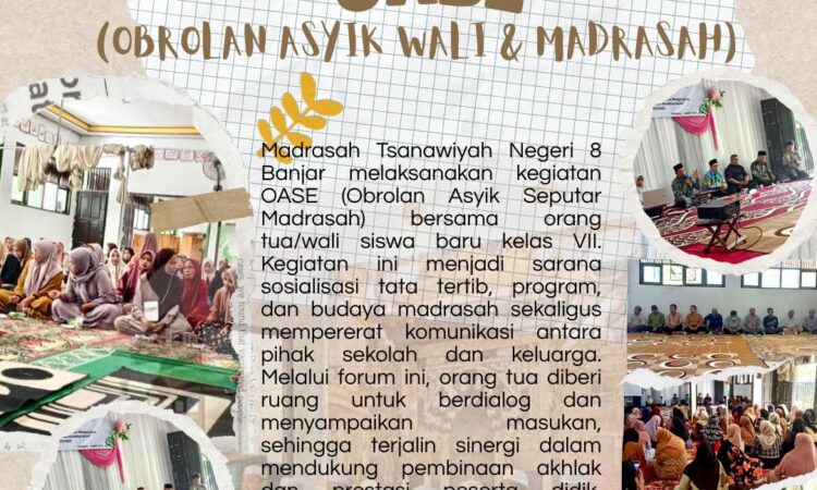 Astambul ( 18 Juli 2025 ) Madrasah Tsanawiyah Negeri 8 Banjar melaksanakan kegiatan OASE ( Obrolan Asyik Seputar Madrasah) bersama orang tua/wali siswa kelas VII. Kegiatan ini menjadi sarana sosialisasi tata tertib, program, dan budaya madrasah sekaligus memperkuat komunikasi antara pihak sekolah dan keluarga. Melalui forum ini, orang tua diberi ruang untuk berdialog dan menyampaikan masukan sehingga terjalin sinergi dalam mendukung pembinaan akhlak dan prestasi siswa. Suasana kegiatan berlangsung hangat dan penuh rasa kekeluargaan.