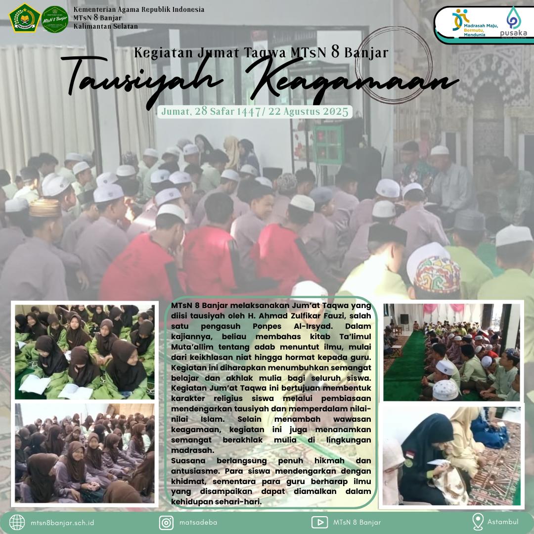 Madrasah Tsanawiyah Negeri 8 Banjar melaksanakan Jum’at Taqwa yang diisi tausiyah olah H. Ahmad Zulfikar Fauzi, salah satu pengasuh ponpes Al-Irsyad. Dalam kajiannya, beliau membahas kitab Ta’limul Muta’alim tentang adab menuntut ilmu mulai dari keikhlasan niat hingga hormat kepada guru.