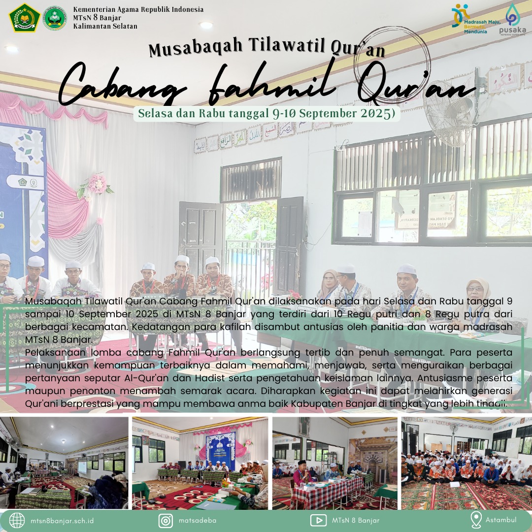 Musabaqah Tilawatil Qur’an (MTQ) tingkat Kabupaten Banjar ke-48 tahun 2025. Salah satu cabang yang dilombakan adalah Fahmil Qur’an. Kegiatan ini dilaksanakan di MTsN 8 Banjar pada tanggal 9 hingga 10 September 2025 dengan menghadirkan peserta dari berbagai kecamatan yang terbagi ke dalam 8 regu putra dan 10 regu putri. Kehadiran para kafilah disambut antusias oleh panitia dan masyarakat sekitar.