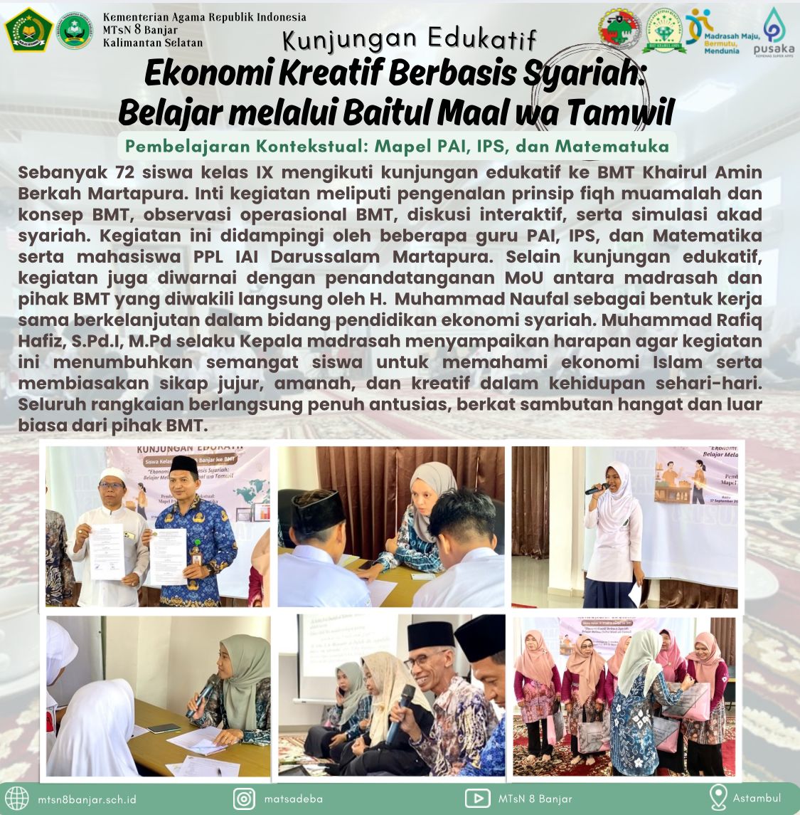 Sebanyak 72 siswa kelas IX MTsN 8 Banjar mengikuti kunjungan edukatif ke BMT Khairul Amin Berkah Martapura. Inti kegatan meliputi pengenalan prinsip fiqh muamalah dan konsep BMT, observasi operasional BMT, diskusi interaktif, sertavsimulasi akad syari’ah.