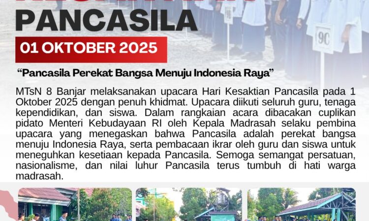 Pada hari Rabu, 1 Oktober 2025, MTsN 8 Banjar melaksanakan upacara peringatan Hari Kesaktian Pancasila dengan khidmat di halaman madrasah. Kegiatan ini menjadi momen penting untuk mengenang sejarah perjuangan bangsa serta meneguhkan kembali nilai-nilai Pancasila sebagai dasar negara. Upacara dimulai pukul 07.30 waktu setempat, yang diikuti oleh kepala madrasah, dewan guru, dan tenaga kependidikan, serta seluruh peserta didik.