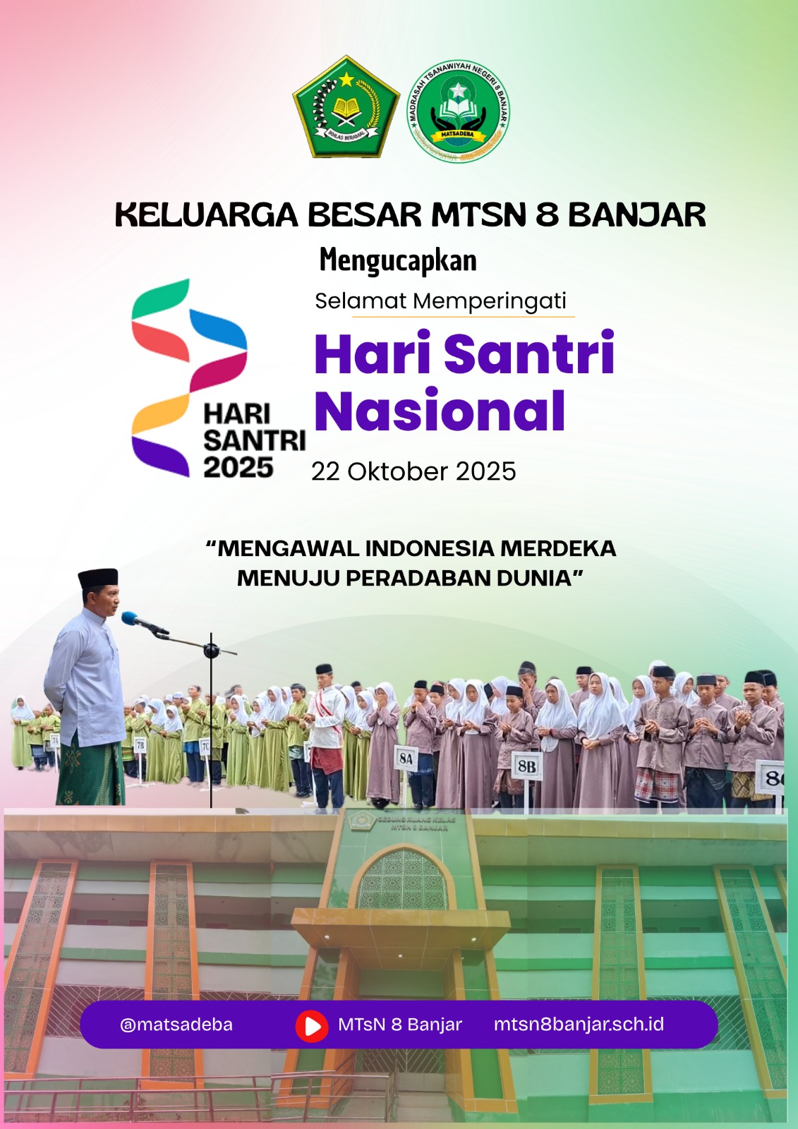 Dalam rangka memperingati Hari Santri Nasional tahun 2025, MTsN 8 Banjar menggelar upacara bendera yang berlangsung dengan khidmat di lapangan upacara madrasah. Kegiatan ini dilaksanakan pada hari Rabu, 22 Oktober 2025, diikuti oleh seluruh siswa-siswi, dewan guru, kepala serta staf tata usaha. Upacara tersebut menjadi momentum penting dalam menumbuhkan semangat santri dan mengenang jasa para ulama serta pejuang Islam yang turut berperan dalam memperjuangkan kemerdekaan bangsa Indonesia.