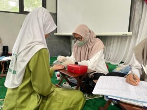 Selain pemeriksaan umum, kegiatan ini juga mencakup skrining anemia pada remaja, yang dilakukan melalui pemeriksaan fisik dan wawancara sederhana mengenai pola makan serta kebiasaan hidup sehat. Anemia merupakan salah satu masalah kesehatan yang sering dialami remaja, terutama pada siswi perempuan, sehingga pemeriksaan ini penting untuk mendukung prestasi belajar dan daya konsentrasi siswa. Petugas puskesmas juga memberikan edukasi tentang pentingnya mengonsumsi makanan bergizi seimbang dan rutin memeriksakan kesehatan.