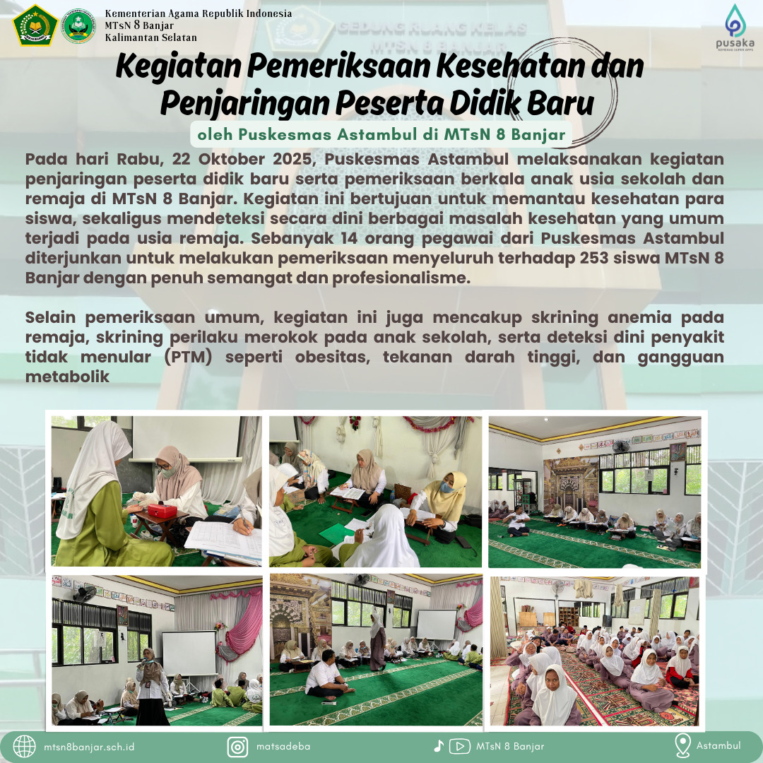 Pada hari Rabu, 22 Oktober 2025, Puskesmas Astambul melaksanakan kegiatan penjaringan peserta didik baru serta pemeriksaan berkala anak usia sekolah dan remaja di MTsN 8 Banjar. Kegiatan ini bertujuan untuk memantau kesehatan para siswa, sekaligus mendeteksi secara dini berbagai masalah kesehatan yang umum terjadi pada usia remaja. Sebanyak 14 orang pegawai dari Puskesmas Asatambul diterjunkan untuk melakukan pemeriksaan menyeluruh terhadap 253 siswa MTsN 8 Banjar dengan penuh semangat dan profesionalisme.