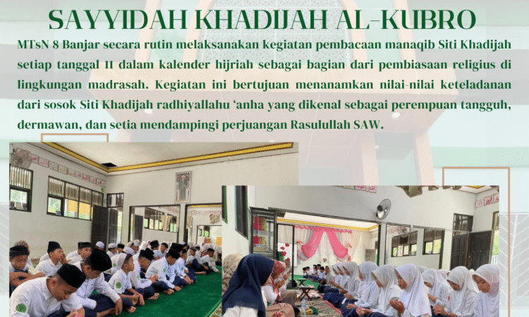 MTsN 8 Banjar secara rutin melaksanakan kegiatan pembacaan manaqib Siti Khadijah setiap tanggal 11 dalam kalender hijriah sebagai bagian dari pembiasaan religius di lingkungan madrasah. Kegiatan ini bertujuan menanamkan nilai-nilai keteladanan dari sosok Siti Khadijah radhiyallahu ‘anha yang dikenal sebagai perempuan tangguh, dermawan, dan setia mendampingi perjuangan Rasulullah SAW.