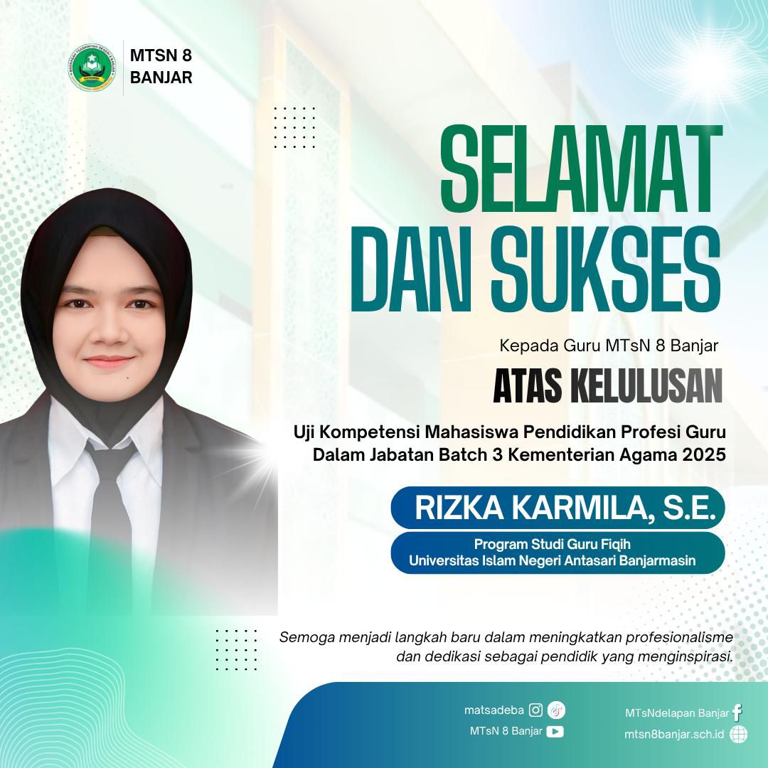 Rizka Karmila, S.E., mahasiswa Program Pendidikan Profesi Guru (PPG) Dalam Jabatan Batch 3 Tahun 2025 dari Program Studi Guru Fiqih Universitas Islam Negeri (UIN) Antasari Banjarmasin, berhasil lulus dalam Uji Kompetensi Mahasiswa Pendidikan Profesi Guru (UKMPPG). Keberhasilan ini menjadi bukti nyata atas kerja keras, dedikasi, dan komitmen beliau dalam mengikuti seluruh rangkaian proses PPG yang meliputi kegiatan akademik, praktik mengajar, serta asesmen kompetensi profesional dan pedagogik.